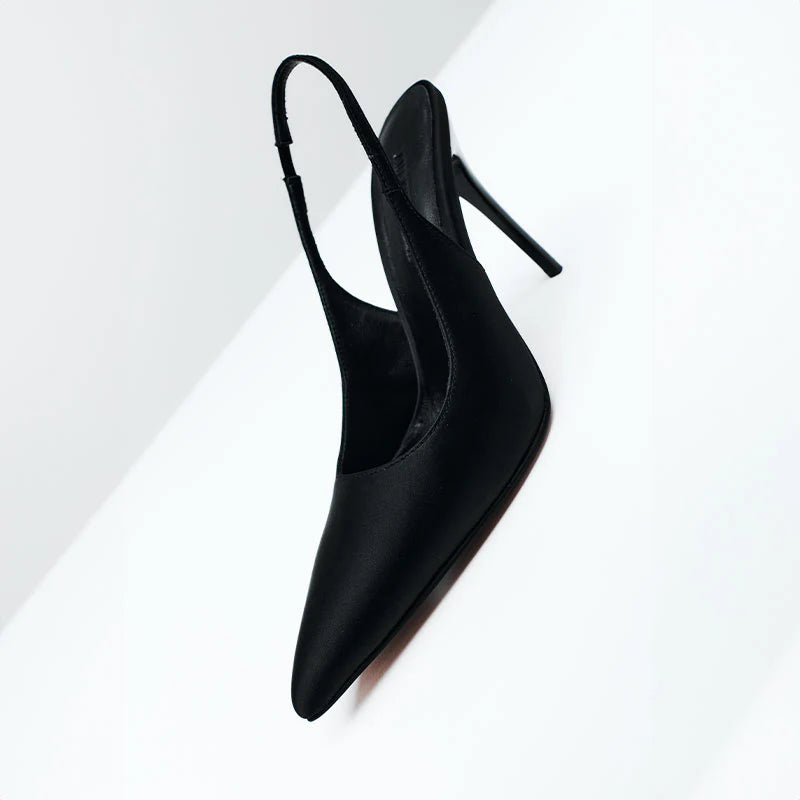 Charlize is the essence of sleek sophistication. Reimagined in rich black satin, this pointed-toe slingback exudes timeless elegance with a modern edge. Finished with a secure elasticated slingback strap, Charlize is the perfect choice for evening events, formal occasions, or effortlessly polished styling.