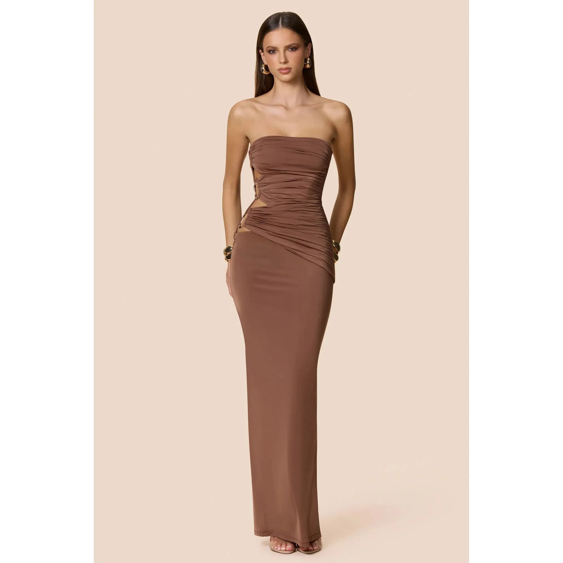 Strapless gown with gold hardware down one side and flattering ruching across the body. Made from our signature slinky jersey with an elevated hand-feel. Invisible zip at back, fully lined.