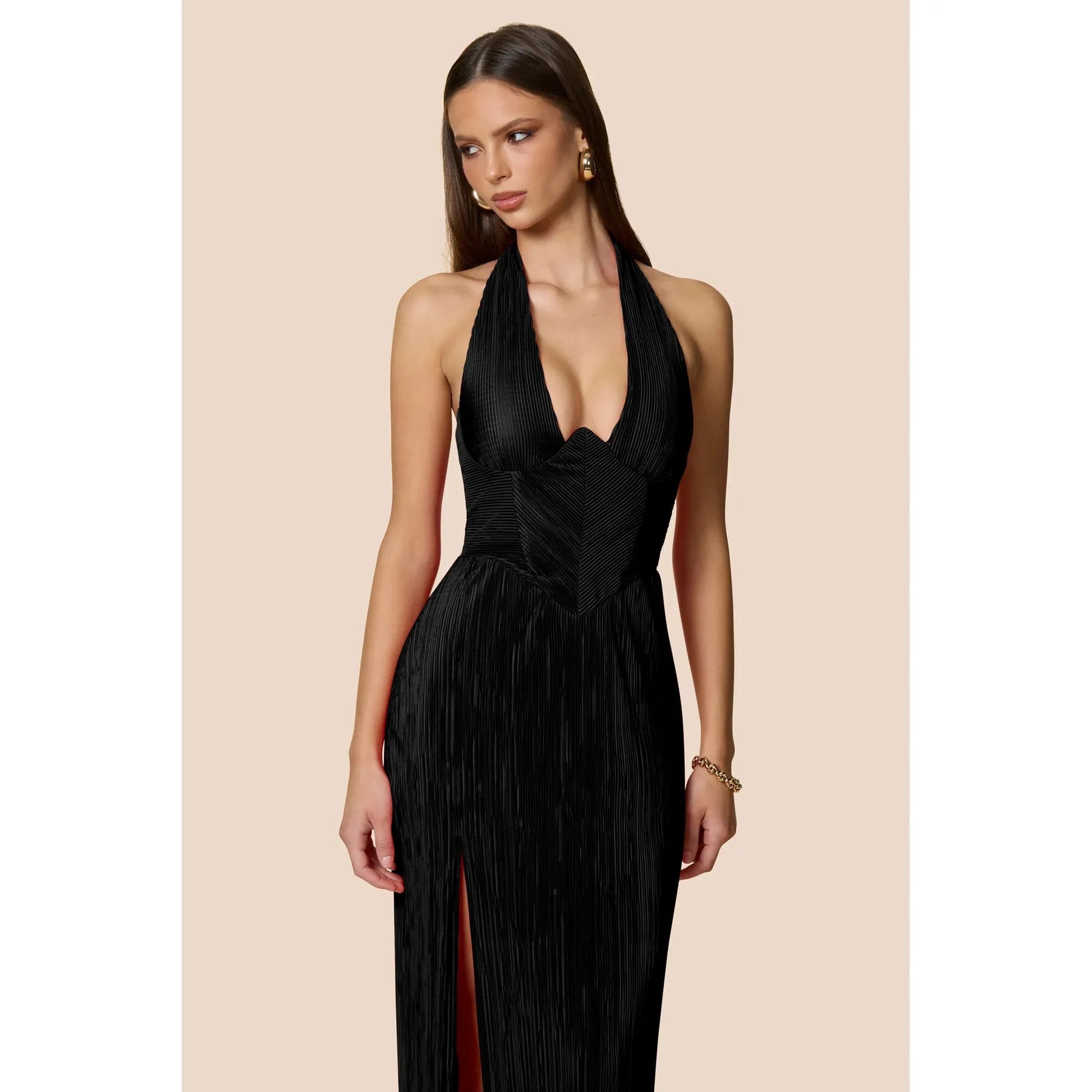 Simply stunning halter style gown with structured bodice for a snatched silhouette. Thigh high split, long ties at back neck and invisible zip closure at back. Made from our popular pleated fabrication, fully lined.
