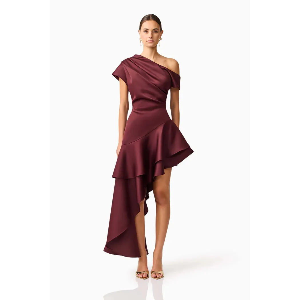 Make a bold entrance in the Livia Asymmetrical Gown in Burgundy – a timeless evening dress designed to captivate. Crafted from luxurious duchess satin fabrication, this gown features a striking asym neckline that draws the eye, balanced by its sculptural silhouette and cascading frill skirt tiers that add soft movement with every step.