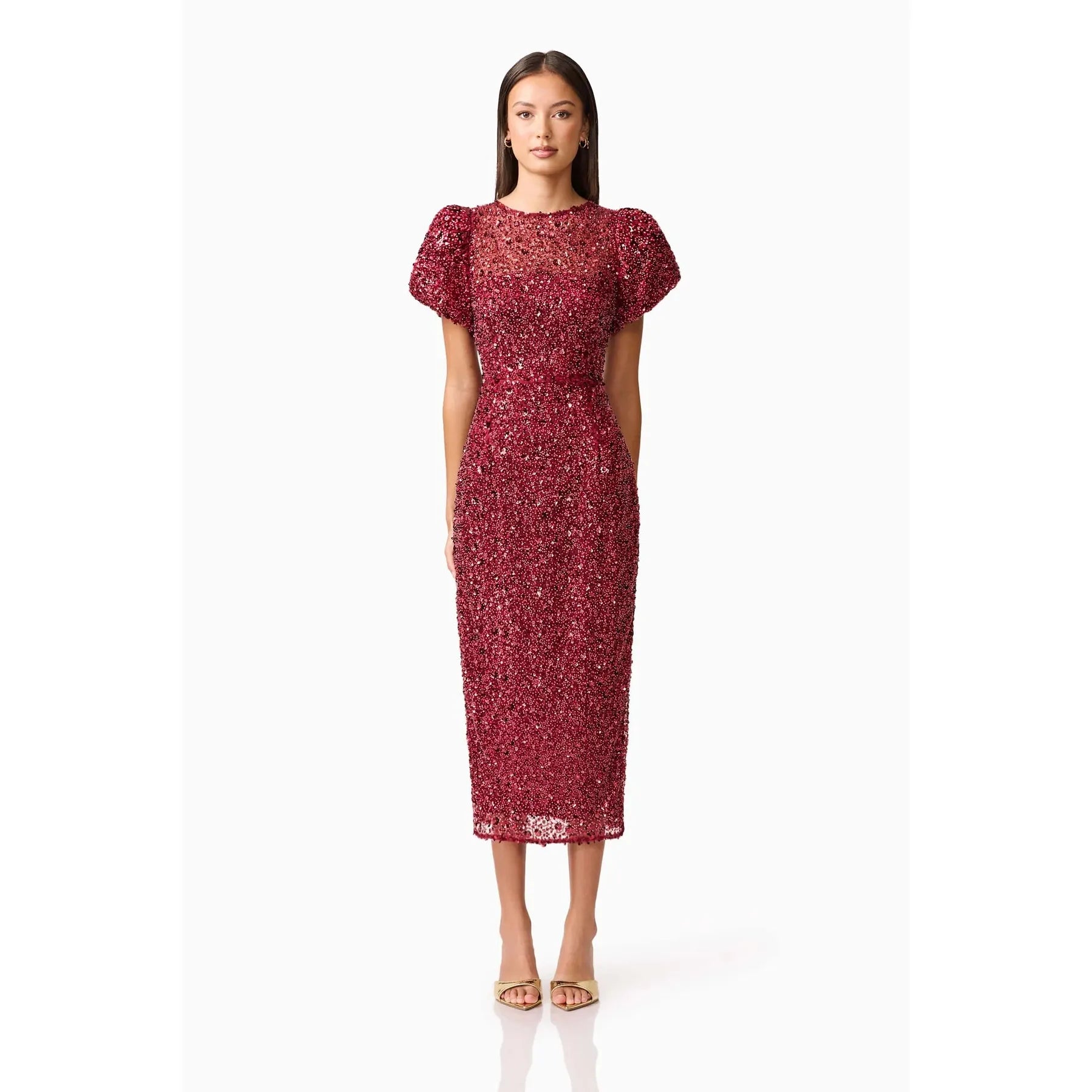 Elegant with a touch of drama, the Carmen Puff Sleeve Midi Dress in Red is a standout piece for special occasions. Crafted from a soft beaded mesh fabrication, it offers subtle shimmer and intricate texture that elevates its timeless silhouette.