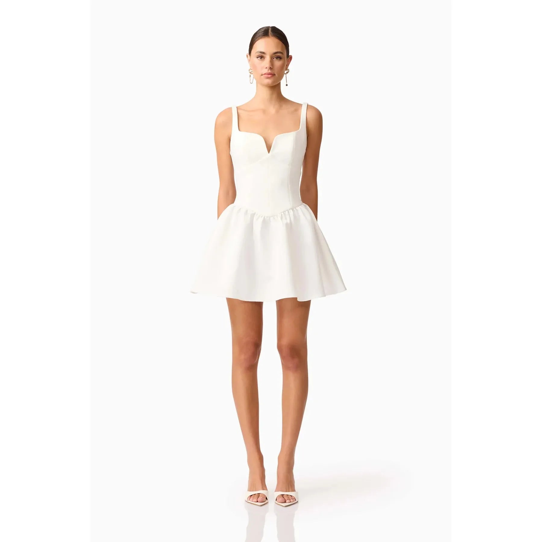Effortlessly polished with a modern feminine touch, the Hester A-Line Mini Dress in White is a refined staple designed to flatter. Crafted from Bella stretch crepe and satin fabrication, this piece balances soft sheen with subtle structure. The fitted bodice and flare skirt offer a classic A-line silhouette that moves with ease.