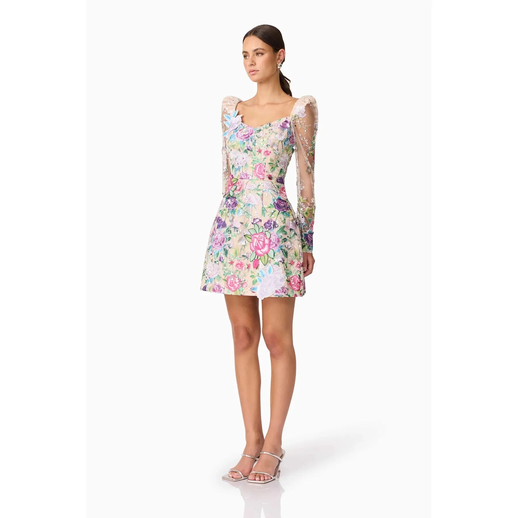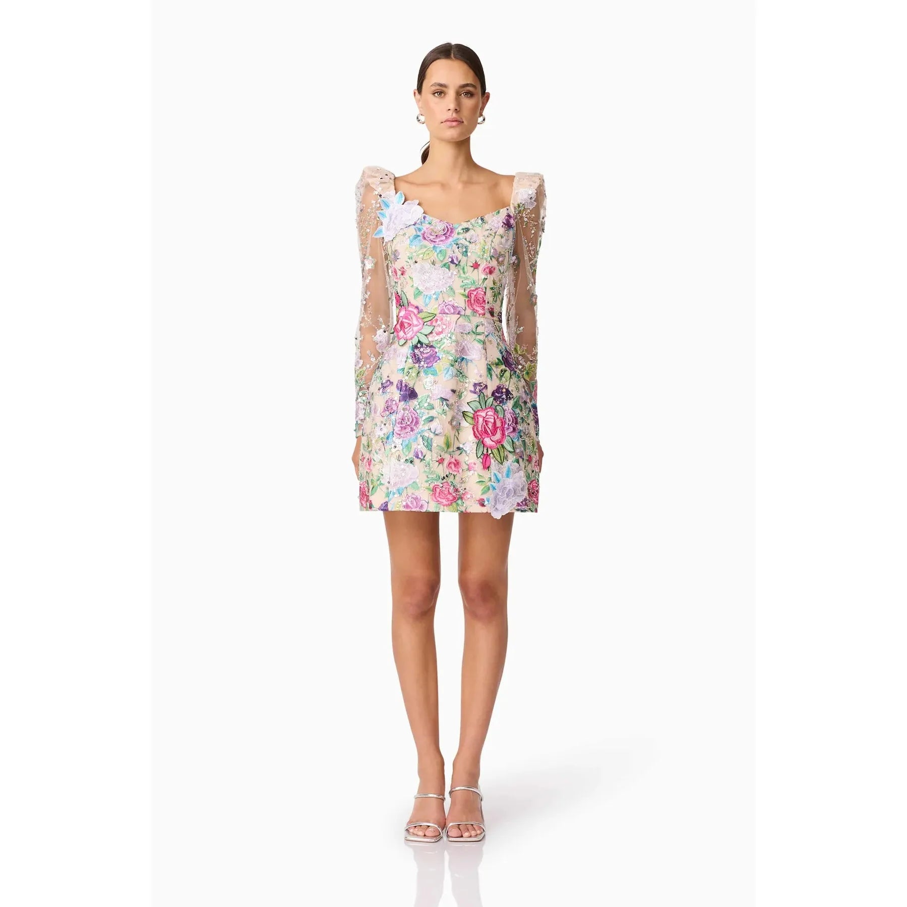 Feminine with a touch of drama, the Eliska Long Sleeve Mini Dress in Floral is designed to make a lasting impression. Crafted from embroidered mesh sequin fabrication, this long puff sleeved mini dress brings texture, shimmer, and romantic charm to any special occasion.