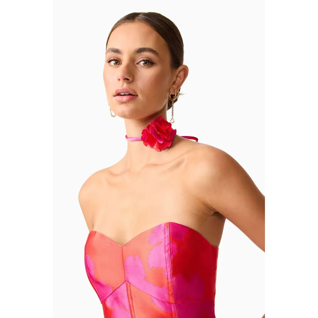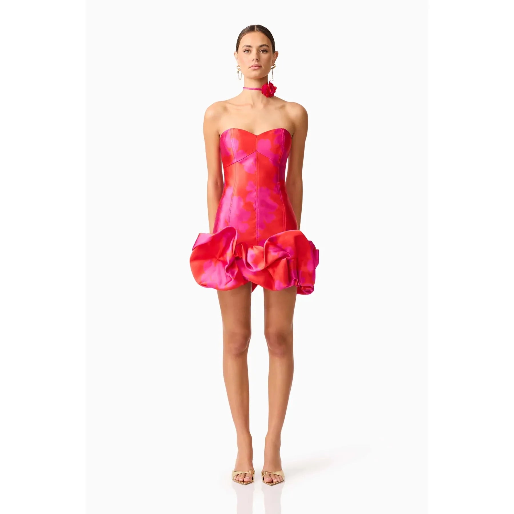 Effortlessly elegant and playfully flirty, the Eloise Strapless Mini Dress in Pink & Red is your go-to look for special occasions, cocktail parties, or a fun summer event. Designed in a structured jacquard fabrication, this sleeveless mini dress offers a luxurious, sculpted fit that holds its shape beautifully. The sweetheart neckline adds a romantic touch, while the rosette tie at the waist brings a feminine and whimsical detail that elevates the overall look.