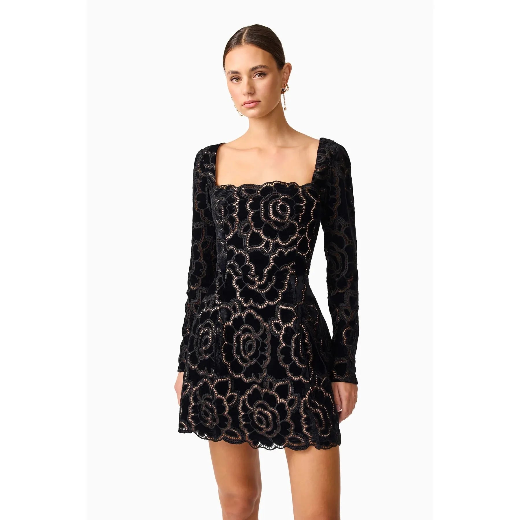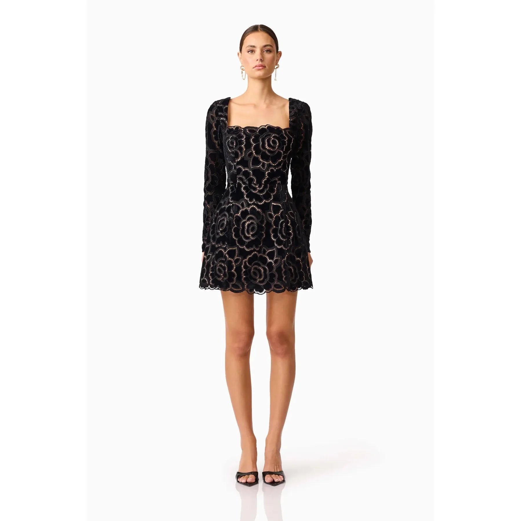 Romantic and refined, the Eris Long Sleeve Mini Dress in Black is designed to leave an impression. This velvet lace long sleeve mini dress is all about texture and structure, crafted from delicate floral velvet fabrication with a sculpted fitted silhouette that flatters effortlessly.