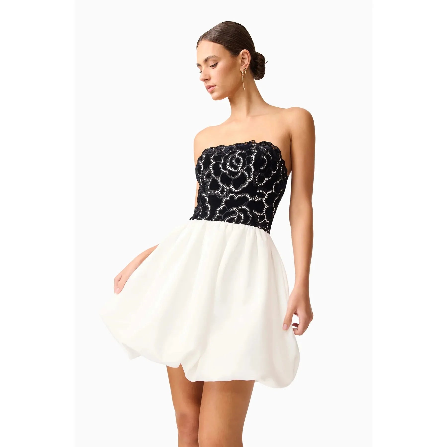 Romantic with a modern edge, the Eris Strapless Mini Dress in Black & White is a show-stopping piece designed for elevated evenings. This velvet lace strapless mini dress pairs intricate texture with bold structure, creating a silhouette that’s both playful and poised.