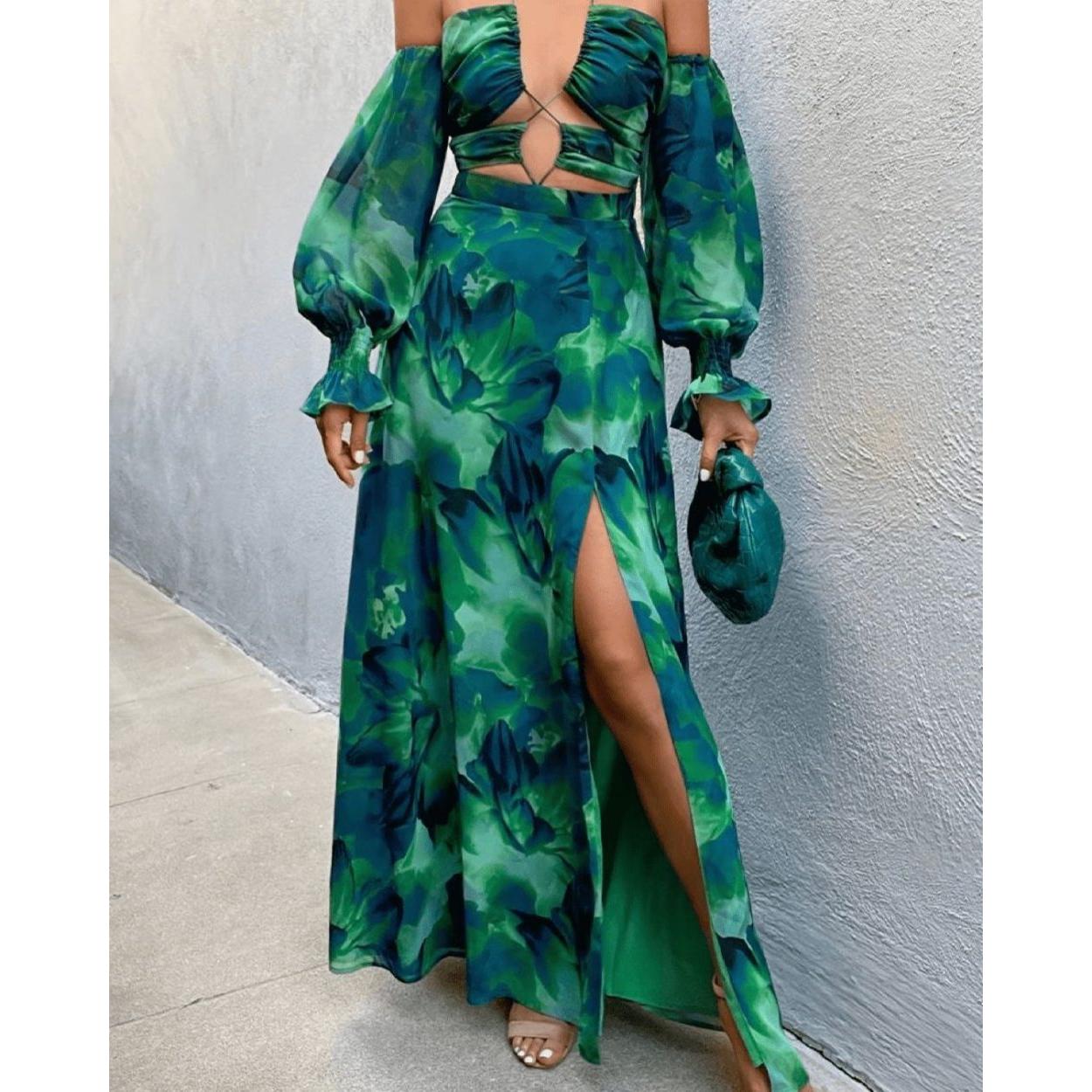 The Karma Dress dress by Runaway The Label features a halter neck style, cut outs under the bust, side split, off the shoulder elastic sleeves, and an invisible centre back zipper. Stand out from the crowd and wow in this green tropical print.