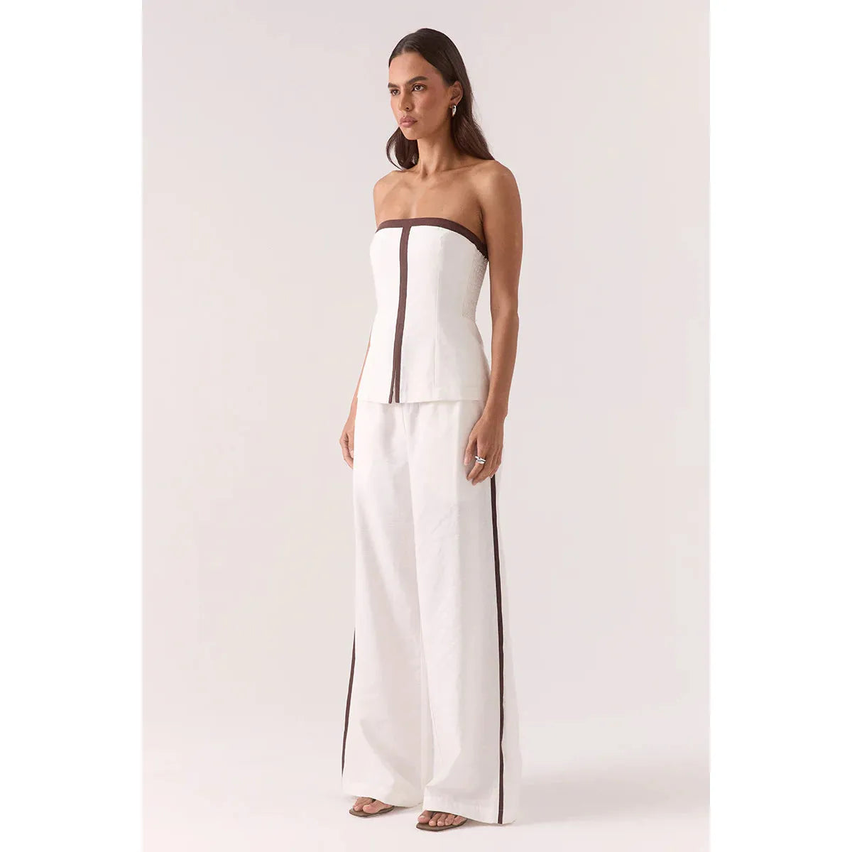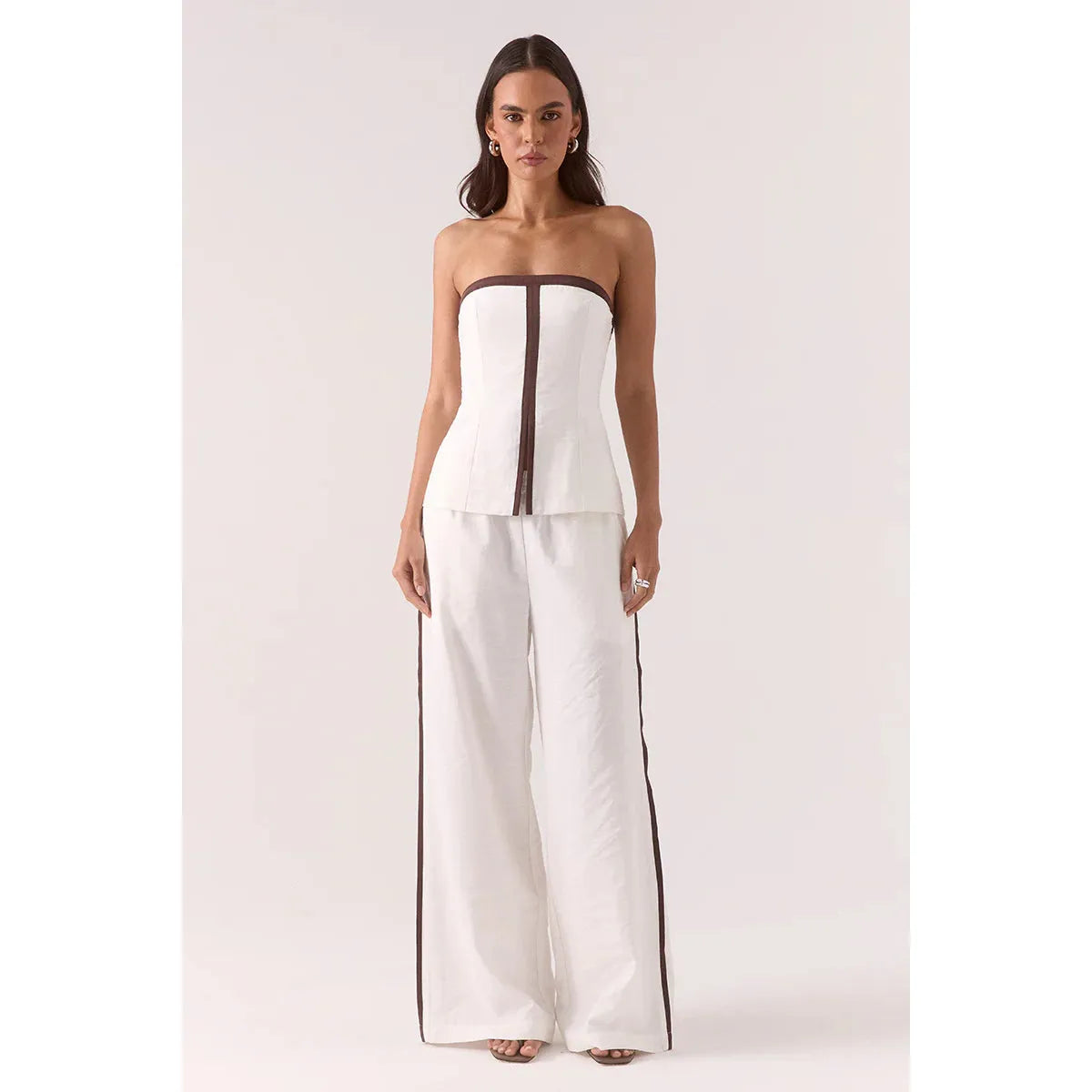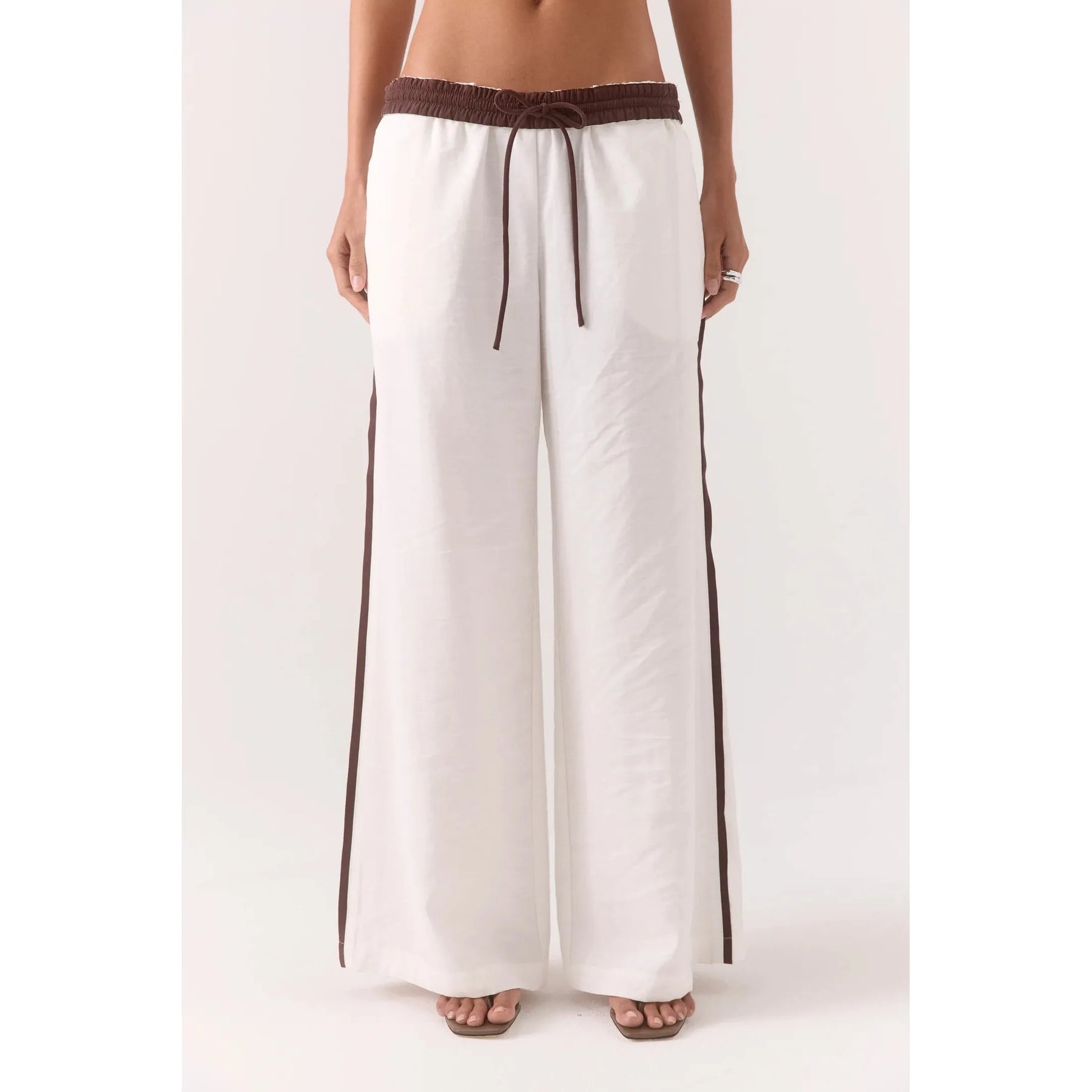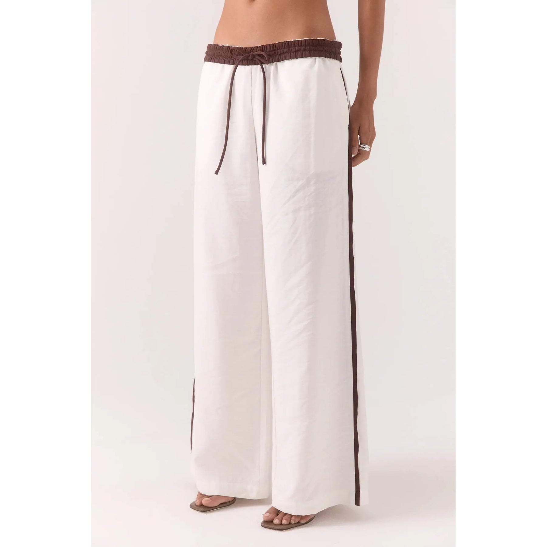 Rayon blend fabrication Mid rise pant Contrast fold over waistband Elasticated waistband Internal drawstring Contrast bind down side of leg Pockets in side seams Fully lined