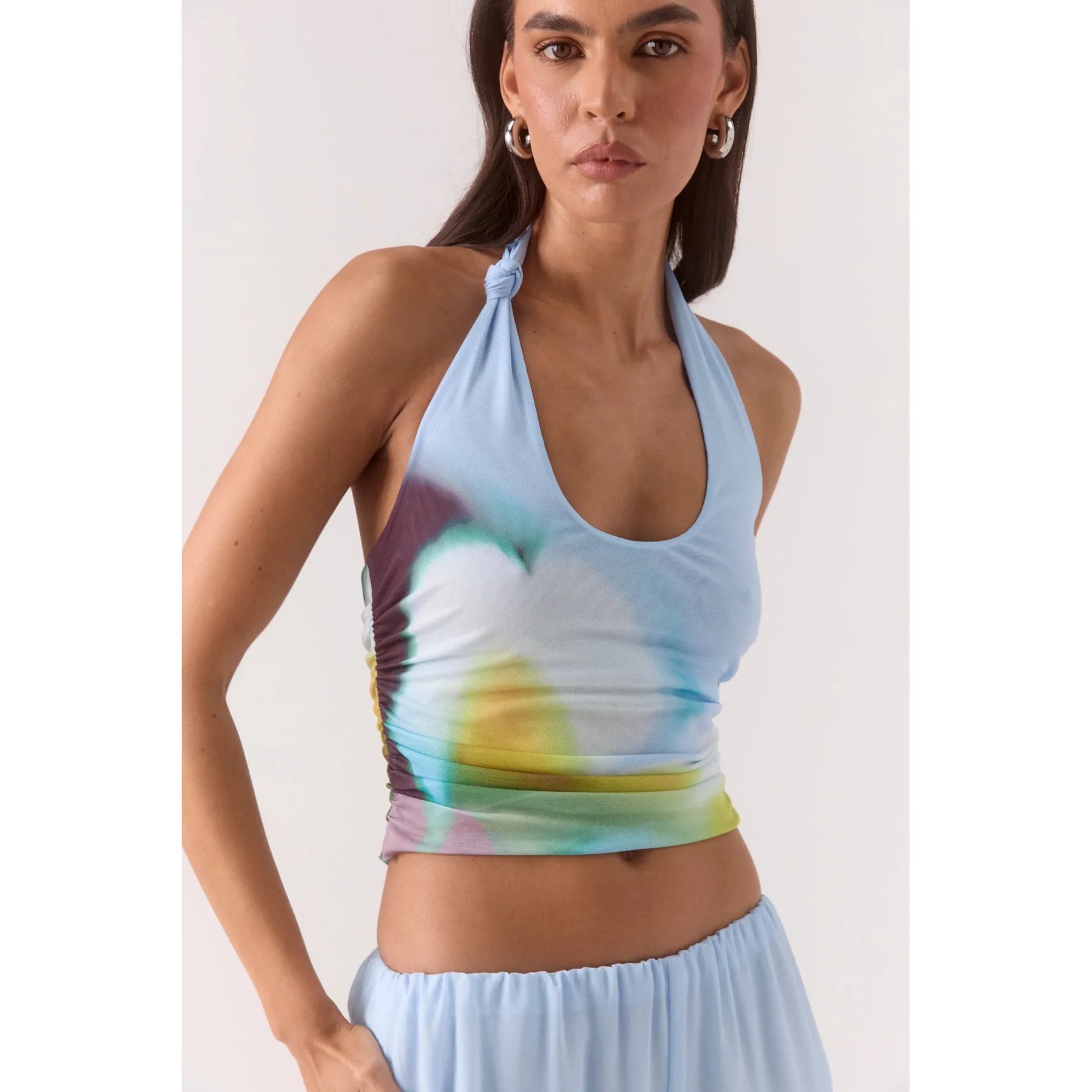 Exclusive print designed in-houseStretch mesh fabricationHalter neck topScoop necklineGather detail on sidesKnot detail on one side of neckPull on functionFully lined